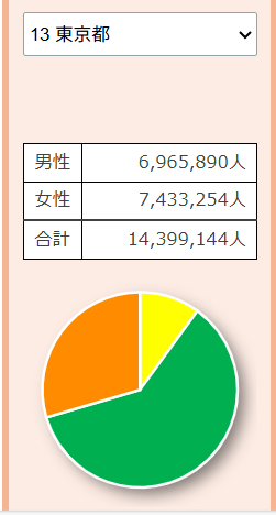 <円グラフの色分け 黄色=若者人口 茶色=高齢者人口 緑色=労働現役世代人口>